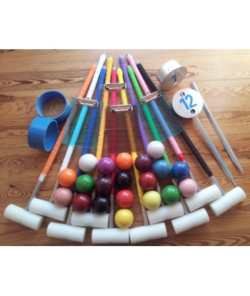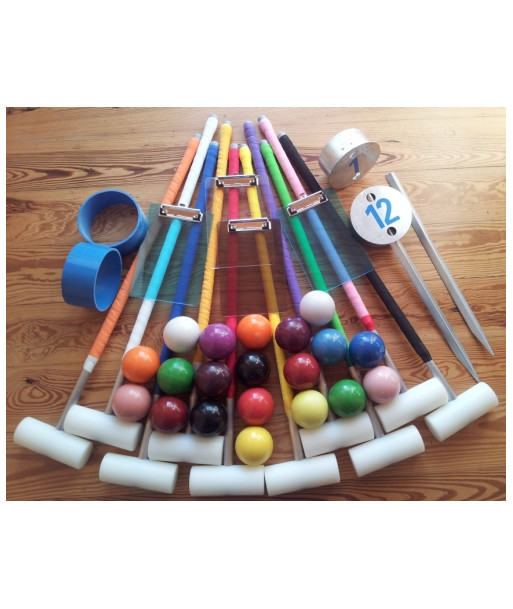 10 køller (~700g), 10 nylonkugler (~270g), 4 clipboards af træ (på billedet dog af plastik), 12 huller/låg/stang.